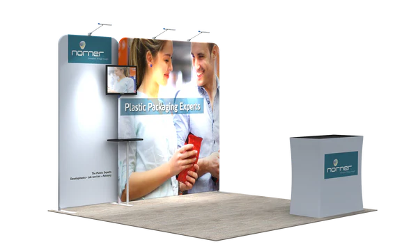Our 10' Exhibit Kits include everything you need to make a big impact at your next trade show or event. You'll get 10 feet in width of custom double-sided printed tension fabric backdrops plus high-powered LED lights and a wooden shelf perfect for displaying brochures, promotional material, or merchandise. Everything packs up into the included hard-shell plastic wheeled case, that seamlessly converts into your booth's custom podium counter. This case allows for easy transportation in any car or plane, as you can check the case into oversized baggage. All kits include a small TV mount with VESA 75mm x 75mm and 100mm x 100mm compatibility.